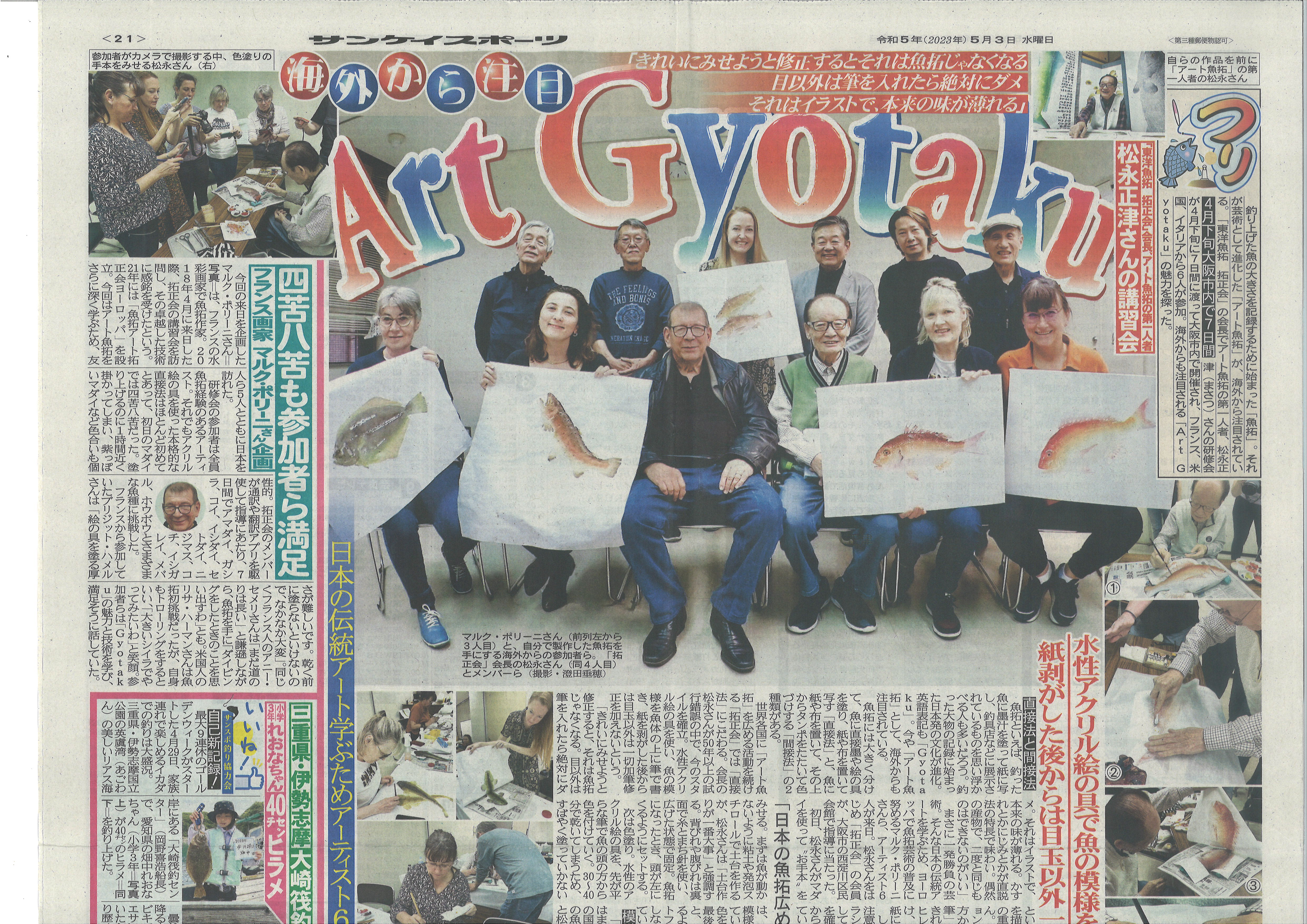2023年4月20日(木)から26日(水)、西淀川区民会館(エルモ西淀川)にて、フランスから4名、イタリアから1名、アメリカから1名の魚拓アーティストの方が、拓正会のアート魚拓を学ぶために来日されました。